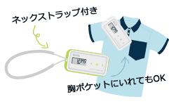 3Dセンサー搭載なので、胸ポケットにいれる、付属のネックストラップで服の内側に入れるなど、服やシーンを選ばずに生活スタイルにあわせていつでも使うことができます。